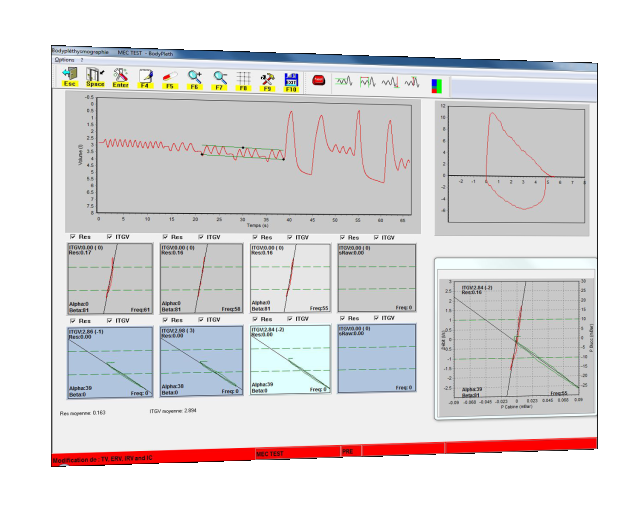 Spirometry/flow-volume, MVV, body plethysmography (resistance loop: SRawtot, SReff, Rawtot, Reff, Rin, Rex, lung volume: TGV, TLC, RV, RV%TLC ), ROCC, PImax/ PEmax/ P100, offline input of many configurable parameters (blood gas, patient questionaires, etc..)